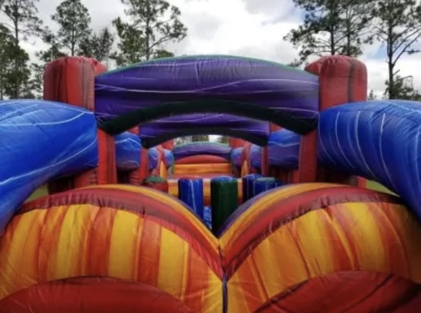 This 40 FT Foot Long Rainbow Obstacle Course rental is something that demands attention. This obstacle is filled with so many beautiful marble colors. Children will be able to compete with each other, slide down a slide and run through pop ups.