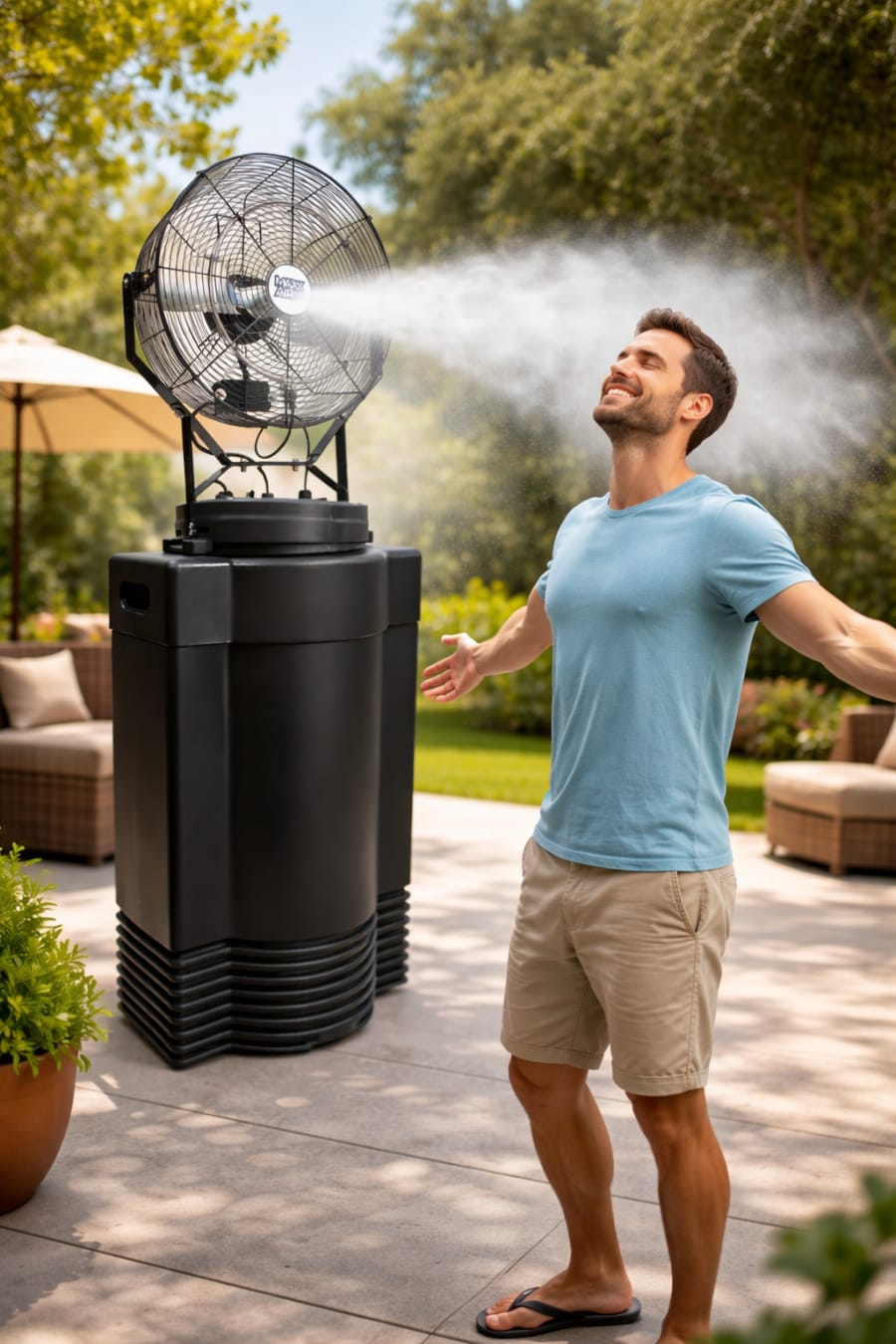 The fan sprays a fine, atomized mist into a high-volume airflow. The tiny droplets evaporate quickly. Evaporation lowers air temperature instantly. The result is comfortable cooling without heavy wetness. Setup takes minutes. Operation is quiet and efficient.
