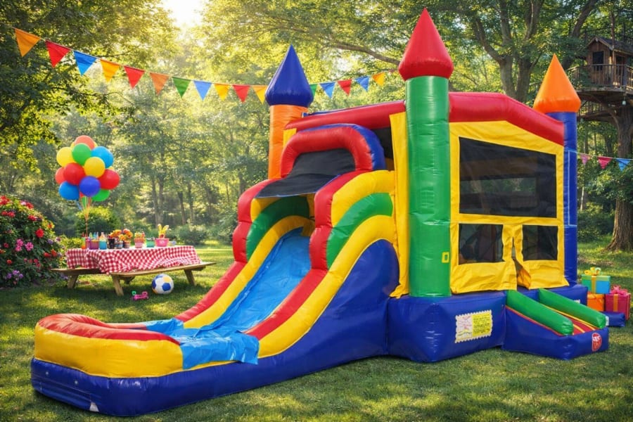 This tropical combo bounce house is a 5 in 1 unisex . This bounce house does come with a slide. poppers and a basketball goal. The colors of this unit can go with many themes such as paw patrol and many more. This unit is safe for children with the proper netting and safe for all ages.