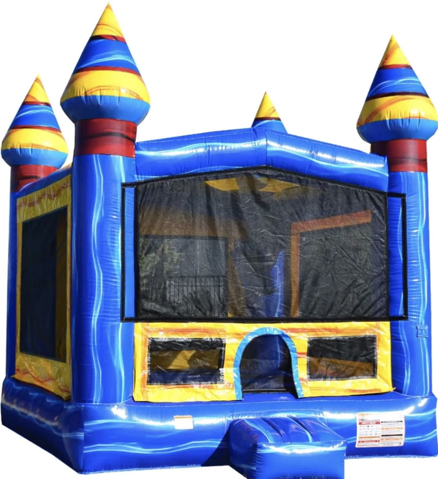 This bounce house colors are amazing with the flourishing marble colors. This bounce house has a basketball goal located on the inside . This unit is the perfect color for a paw patrol, baby shark, toy story and many more.