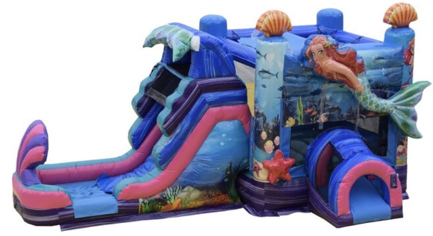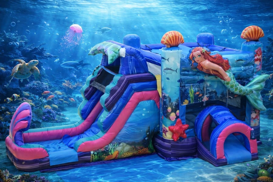 Take a trip under the sea with this beautiful mermaid bounce house. This mermaid inflatable is one of a kind. The little mermaid has been a classic for years but to have the experience of having a mermaid bounce house at a party is one of a kind. The mermaid bouncy house combo is attached with a slide which can be used dry or as a waterslide.