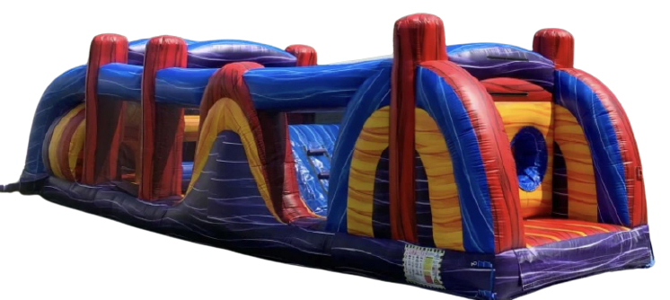 This 40 FT Foot Long Rainbow Obstacle Course rental is something that demands attention. This obstacle is filled with so many beautiful marble colors. Children will be able to compete with each other, slide down a slide and run through pop ups.